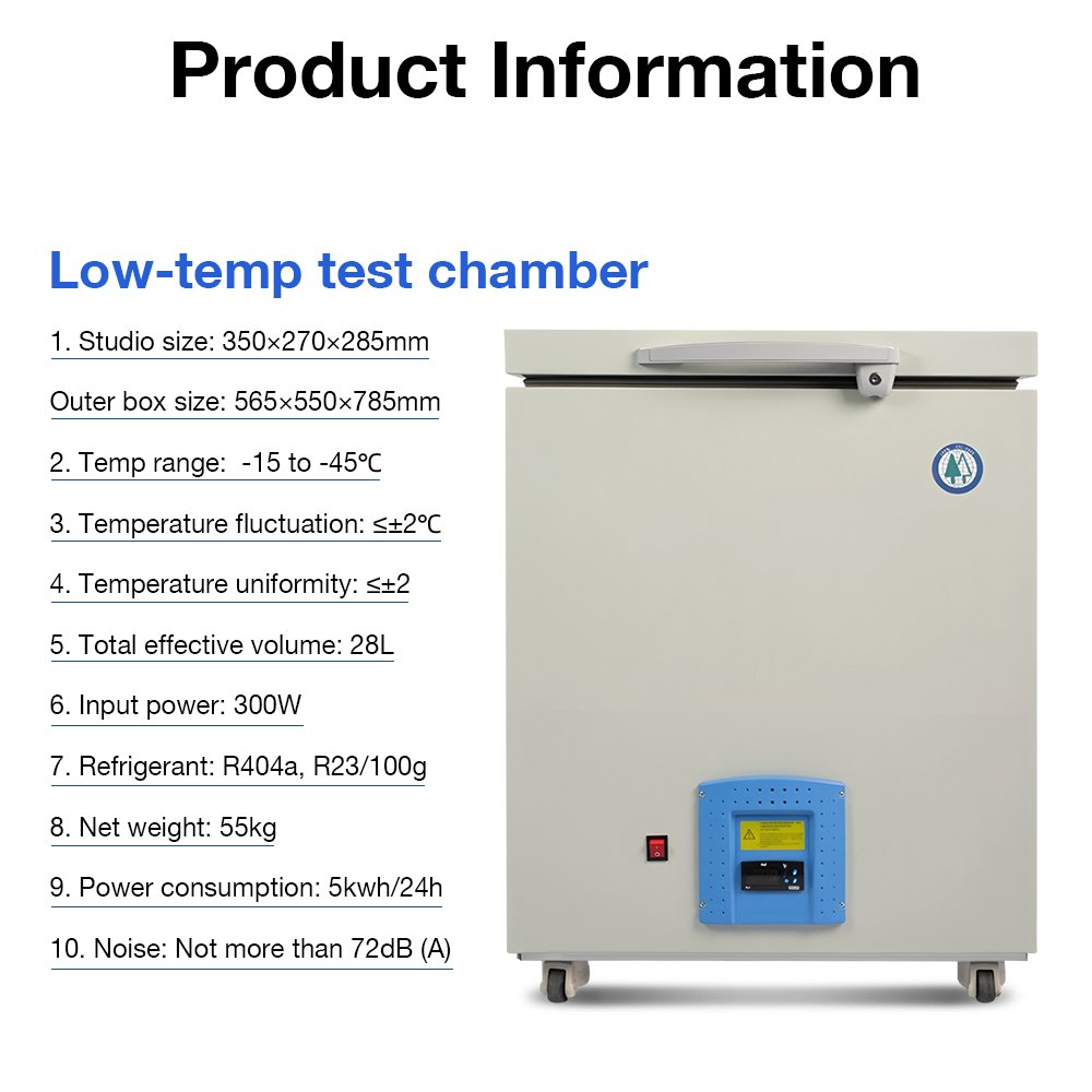 This 28L adjustable low-temperature test chamber is a precision instrument designed for reliable testing and conditioning within a stringent temperature range of -15°C to -45°C. It provides a stable, controlled environment ideal for evaluating material properties, component performance, and product durability under extreme cold conditions.