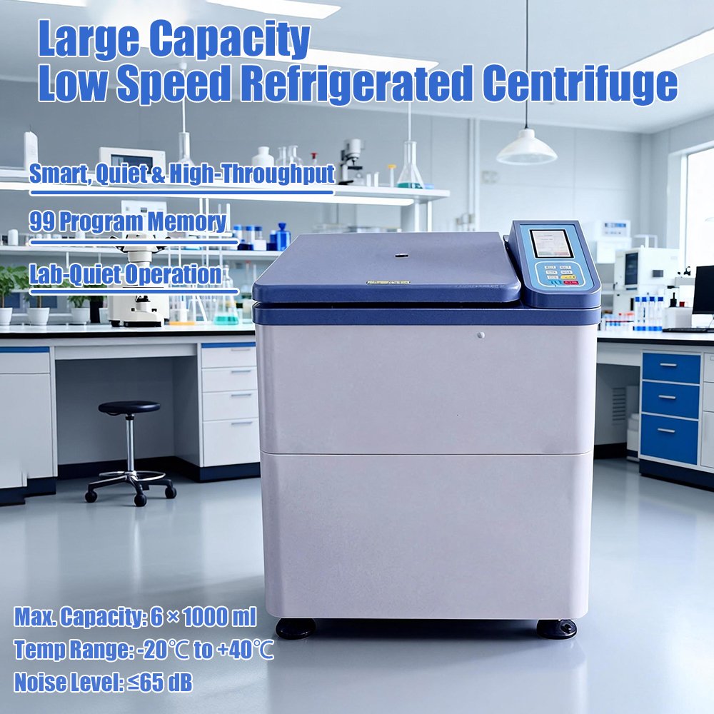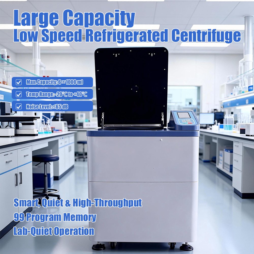 Large Capacity Low-Speed Refrigerated Centrifuge is an essential laboratory instrument designed for the gentle separation of temperature-sensitive biological samples at high volumes. Operating at lower speeds , it generates sufficient centrifugal force for pelleting cells, organelles, or precipitates while minimizing heat generation and shear forces that could damage delicate samples. Its integrated refrigeration system maintains a precise, adjustable temperature range , ensuring sample integrity throughout the processing time.