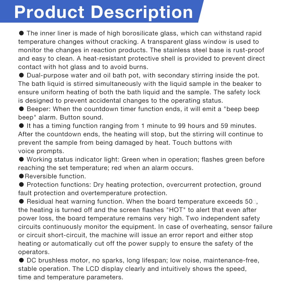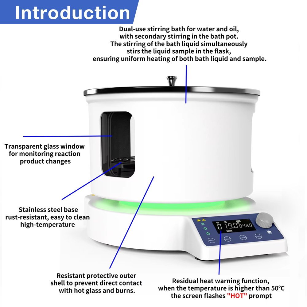 Equipped with over-temperature alarms and dual safety protection, it guarantees safe operation. Widely used in chemistry, materials science, and pharmaceuticals for reactions, distillation, and concentration, it provides a reliable, high-temperature stirring environment.