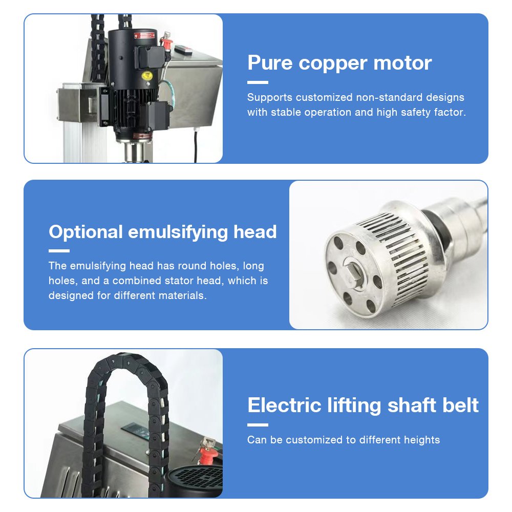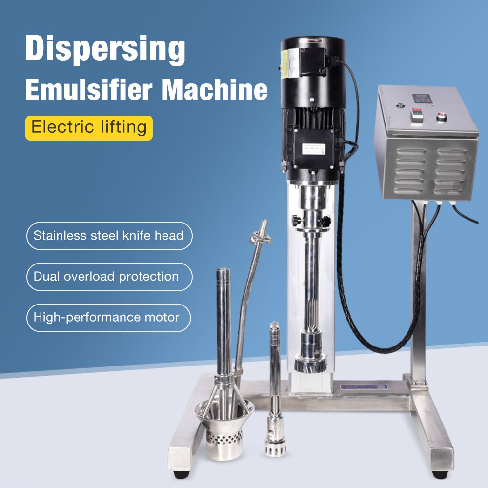 The Electric Lifting Dispersing Emulsifier Machine is a versatile and high-performance industrial mixing equipment designed for efficient fluid processing. It integrates a powerful high-speed disperser with a precise emulsifying mechanism, both mounted on an electrically controlled lifting column. This unique lifting system allows vertical adjustment of the mixing head, enabling operation at various depths within the vessel for optimal homogenization.